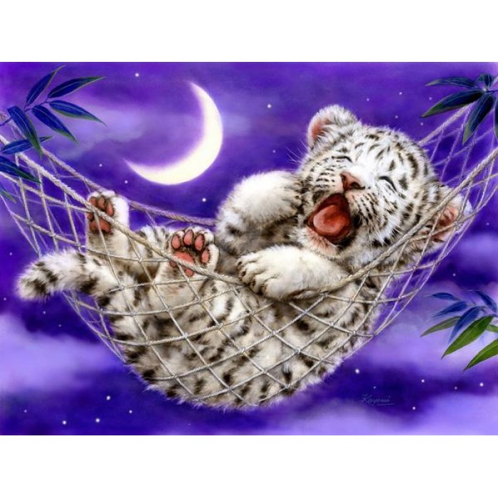 Feel the satisfaction of watching your Diamond Painting come together before your very eyes. This gorgeous artwork entitled "Hammock White Tiger" by artist Kayomi Harai is now available as a Full Drill Diamond Painting Kit in your choice of Square or Round Diamonds.