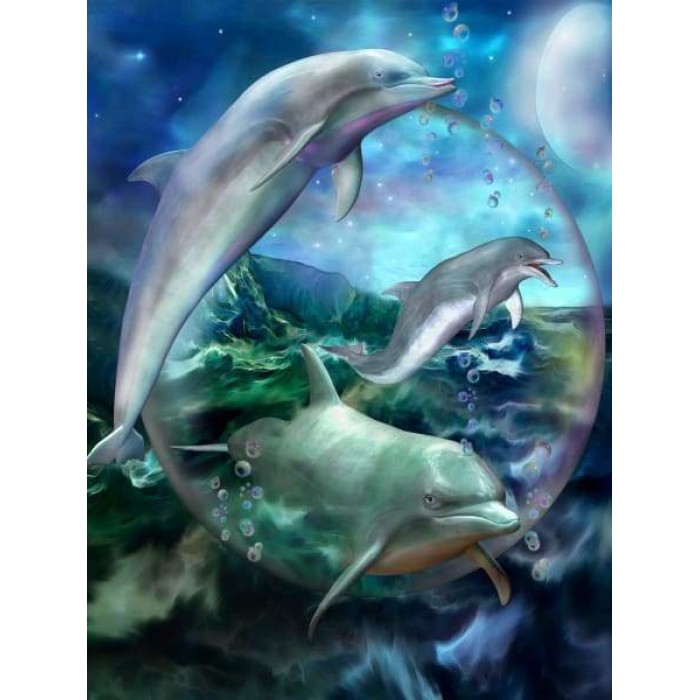 Create your own shimmering DIY wall art, one "diamond" at a time! This gorgeous full drill Diamond Painting Kit is entitled "Three Dolphins" and includes everything you need to get started!