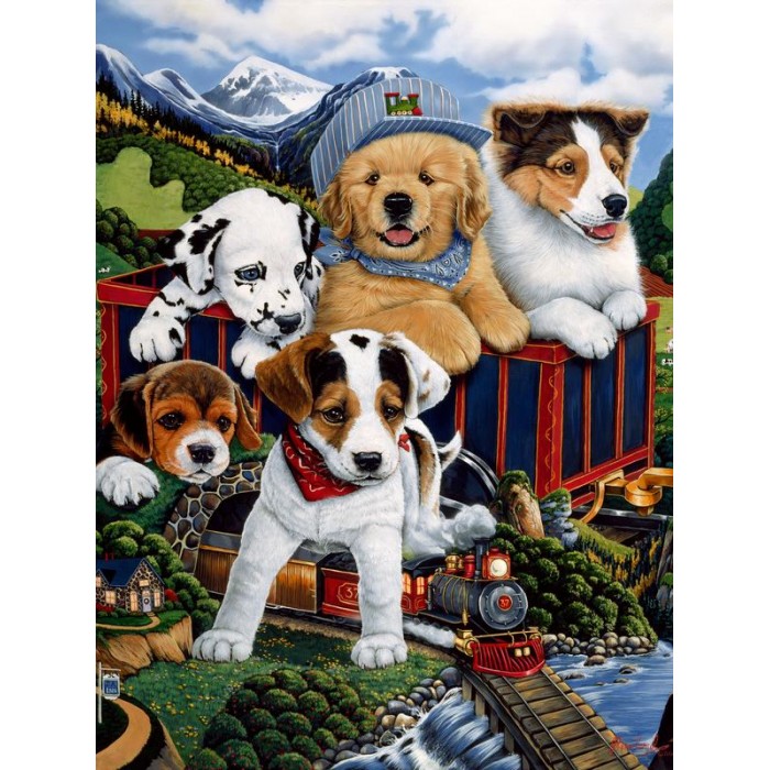 Feel the satisfaction of watching your Diamond Painting come together before your very eyes. This gorgeous artwork entitled "Choo Choo Puppies" by artist Jenny Newland is now available as a Full Drill Diamond Painting Kit in your choice of Square or Round Diamonds.