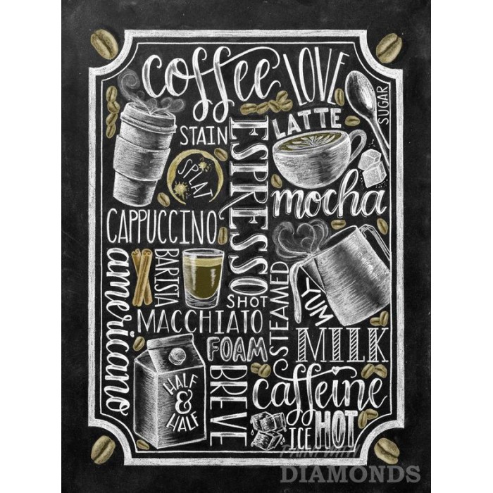 Feel the satisfaction of watching your Diamond Painting come together before your very eyes. This gorgeous artwork entitled "Coffee Collage" by artist Shannon Roberts is now available as a Full Drill Diamond Painting Kit in your choice of Square or Round Diamonds.