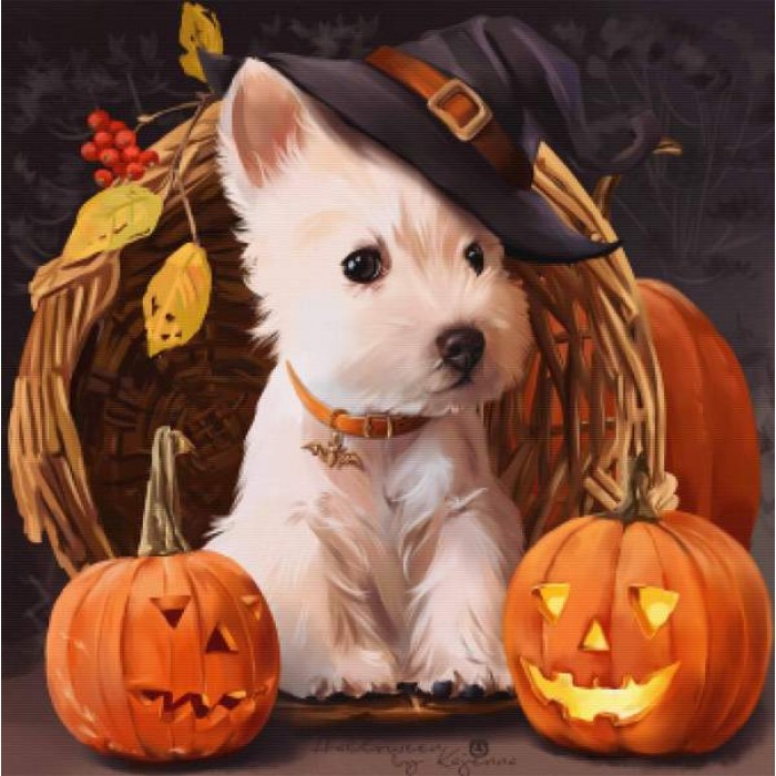 Create your own shimmering DIY wall art, one "diamond" at a time! This gorgeous full drill Diamond Painting Kit is entitled "Puppies And Pumpkins" and..