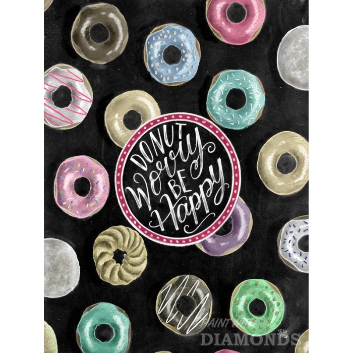 Feel the satisfaction of watching your Diamond Painting come together before your very eyes. This gorgeous artwork entitled "Donut Worry Be Happy" by artist Shannon Roberts is now available as a Full Drill Diamond Painting Kit in your choice of Square or Round Diamonds.