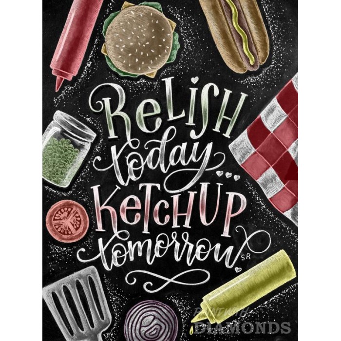 Feel the satisfaction of watching your Diamond Painting come together before your very eyes. This gorgeous artwork entitled "Relish Today, Ketchup Tomorrow" by artist Shannon Roberts is now available as a Full Drill Diamond Painting Kit in your choice of Square or Round Diamonds.