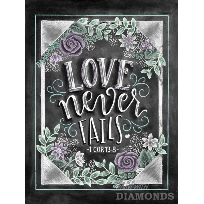 Feel the satisfaction of watching your Diamond Painting come together before your very eyes. This gorgeous artwork entitled "Love Never Fails" by artist Shannon Roberts is now available as a Full Drill Diamond Painting Kit in your choice of Square or Round Diamonds.