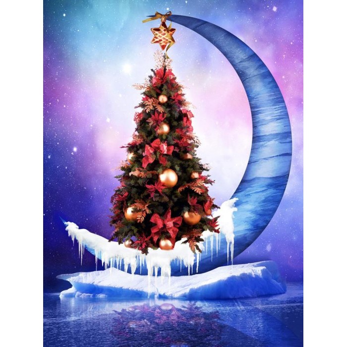 Create your own shimmering DIY wall art, one "diamond" at a time! This gorgeous full drill Diamond Painting Kit is entitled "Frozen Moon With Christmas Tree" and includes everything you need to get started!