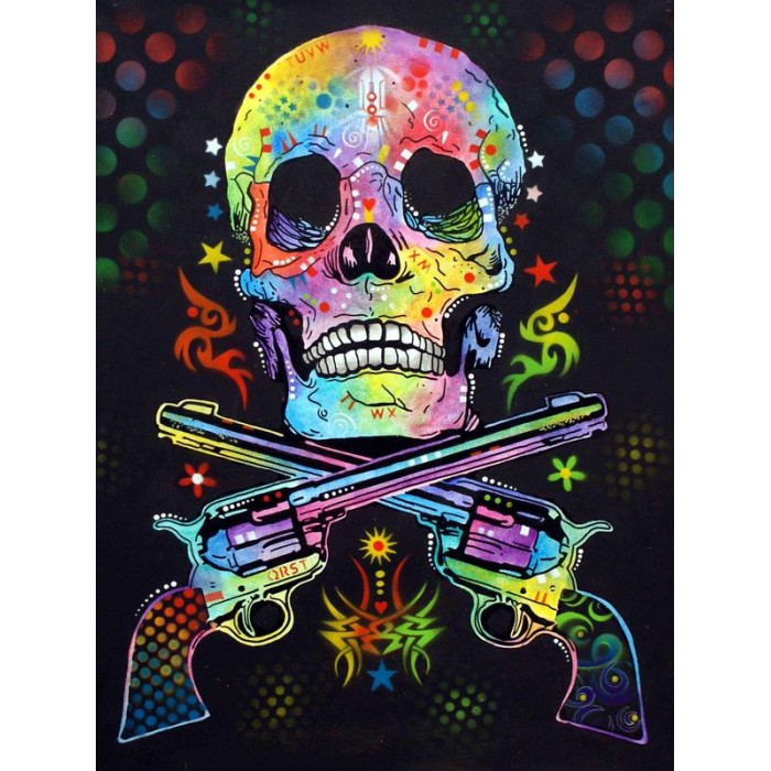 Feel the satisfaction of watching your Diamond Painting come together before your very eyes. This gorgeous artwork entitled "Skull & Guns" by artist Dean Russo is now available as a Full Drill Diamond Painting Kit in your choice of Square or Round Diamonds.