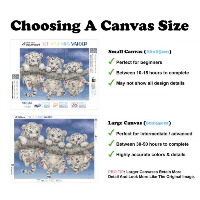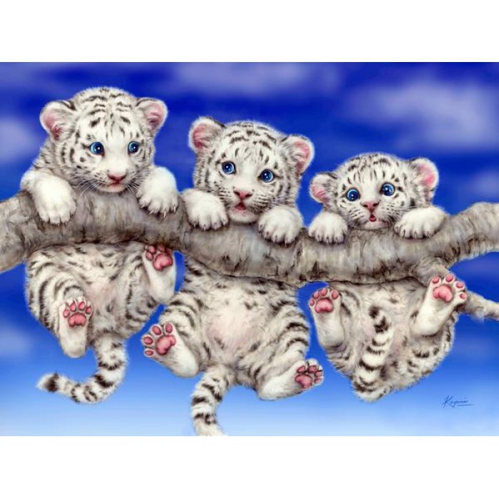 Feel the satisfaction of watching your Diamond Painting come together before your very eyes. This gorgeous artwork entitled "White Tiger Triplets" by artist Kayomi Harai is now available as a Full Drill Diamond Painting Kit in your choice of Square or Round Diamonds.